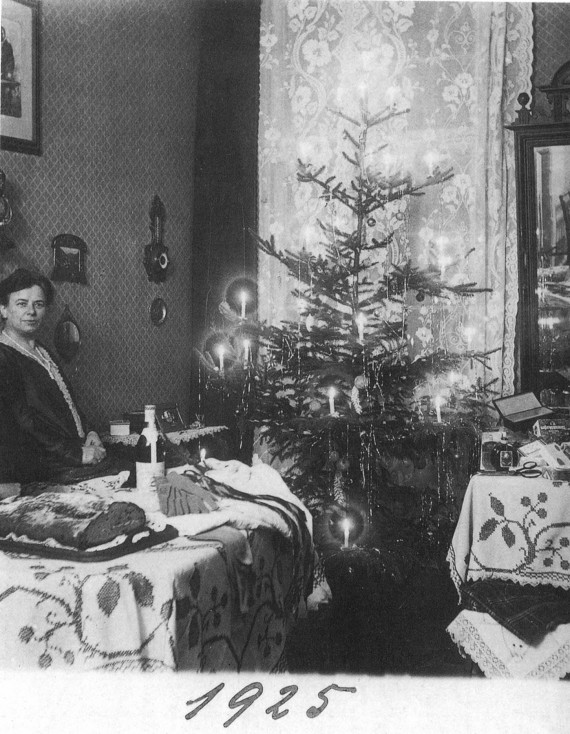 Bei den Wagners scheinen wieder bessere Zeiten angebrochen zu sein, auch wenn sie in diesem Jahr, den Notizen auf der Fotorückseite zufolge, nur wenig für Geschenke ausgaben. Recht zufrieden posiert Anna Wagner vor Kleiderstoff und Schere, einer Flasche Likör der Marke Fuggergold und Gerold Confect. Ihr Gatte erhielt Sellnercognac, Hemden, ein Paar graue Handschuhe und neue Krawatten.