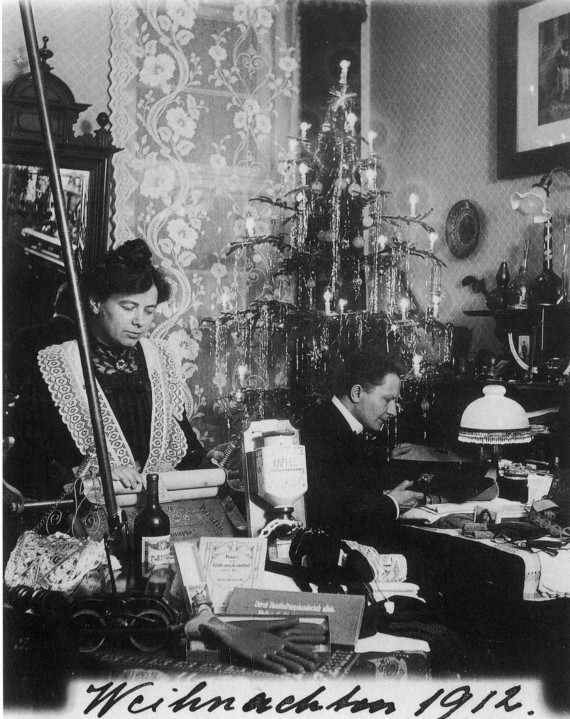 Der gerade erst begründete Zweckverband Groß-Berlin hatte ein Wirtschaftsjahr erlebt, das vom Industrie- und Handelswachstum geprägt war. Trotzdem lebten viele Menschen unter prekären Umständen und waren von Arbeitslosigkeit und Armut bedroht. Den Wagners ging es da vergleichsweise gut. Seit 1911 wohnten sie in einer 2 1/2 Zimmer-Wohnung im Bayerischen Viertel, einer gutbürgerlichen Gegend in Berlin-Schöneberg. Als Beamter bei der Reichsbahn hatte Richard Wagner zudem ein gutes und sicheres Einkommen.  Selten haben sie sich so reich beschenken können wie in diesem Jahr, darunter viel Nützliches und Praktisches. Stolz steht die Hausfrau vor der neuen Wäschemangel, einer Kaffeemühle, einem Teppichroller, Gummihandschuhen und dem Buch „Haus- und Gebrauchsmittel aller Art”. Richard Wagner erhielt für den Dienst eine neue Aktentasche, die er hier eingehend begutachtet.