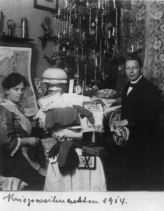 Mit Begeisterung waren Anfang August 1914 viele Männer mit fröhlichem Gesang und ohne jeden Zweifel am Sieg in den Krieg gezogen. Von der Euphorie ließen sich wohl auch die Wagners anstecken: Gleich neben dem Weihnachtsbaum hing eine Landkarte, auf der sie die Truppenbewegungen mit ähnchen markierten. Wie eine böse Vorahnung, was in den kommenden Jahren folgen sollte, steht der neue Wecker in der Mitte des diesjährigen Weihnachtsfotos allerdings schon auf kurz vor Zwölf. Ansonsten lässt sich auf dem Foto noch nichts erahnen von der „Urkatastrophe des 20. Jahrhunderts“. Unter den Geschenken findet sich ein sorgfältig in ein Kuvert gesteckter Geldschein. Ferner gab es eine Packung Schwarzkopf Shampoon, das auf „keinem Gabentisch fehlen“ dürfe, wie eine zeitgenössische Werbung empfahl.