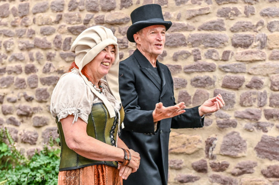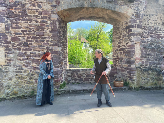 Die beiden Schauspieler Sonnhild und Michael Grevel verkörpern historische Figuren und führen ihre Gäste durch die Burgruine der ehemaligen Reichsburg Hayn und durch die malerische Altstadt von Dreieichenhain.
