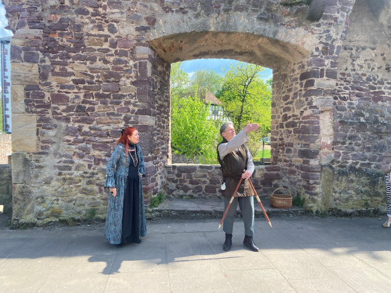 Die beiden Schauspieler Sonnhild und Michael Grevel verkörpern historische Figuren und führen ihre Gäste durch die Burgruine der ehemaligen Reichsburg Hayn und durch die malerische Altstadt von Dreieichenhain.