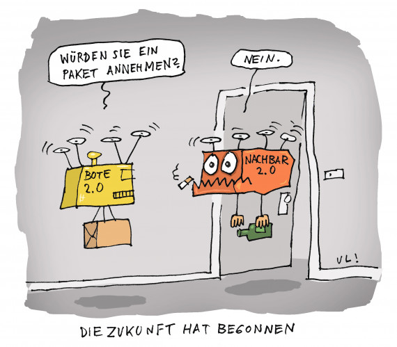 Ein Blick in die Zukunft - nicht immer rosig, aber auf jeden Fall lustig! Kochen auf dem Smartphone, Fahren mit Fotosynthese, Wahlrecht für Roboter, Alien-Fachkräfte gegen den Ärztemangel – 44 Cartoonistinnen und Cartoonisten werfen in dieser Ausstellung einen humorvollen Blick in die Zukunft. Visionär und mit aberwitzigem Erfindungsgeist zeigen sie allen Schwarzsehern und Angsthasen, dass Humor in schweren und turbulenten Zeiten ein viel besserer Ratgeber für die Zukunft ist.