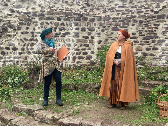 Die beiden Schauspieler Sonnhild und Michael Grevel schlüpfen in historische Figuren und führen ihre Gäste durch die Burgruine der ehemaligen Reichsburg Hayn sowie durch die malerische Altstadt von Dreieichenhain.
