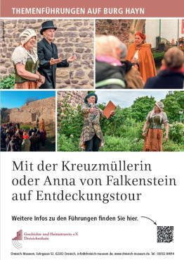 Die beiden Schauspieler Sonnhild und Michael Grevel verkörpern historische Figuren und führen ihre Gäste durch die Burgruine der ehemaligen Reichsburg Hayn und durch die malerische Altstadt von Dreieichenhain.