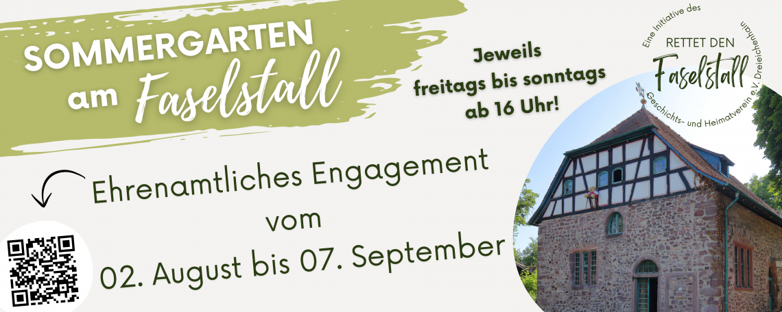 Nach dem Erfolg des letzten Jahres bewirten wir auch in diesem Jahr den Garten vor dem Faselstall zwischen 02. August und 07. September. Organisiert und durchgeführt von ehrenamtlichen Helferinnen und Helfern öffenen wir unsere Türen von Freitag bis Sonntag jeweils ab 16 Uhr. Wir freuen uns, euch wieder bei kühlen Erfrischungen und leckeren Snacks begrüßen zu dürfen. Die Einnahmen gehen dem Erhalt des historischen Faselstalls zugute!