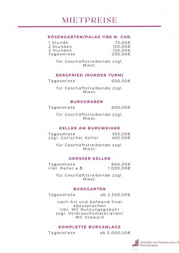 Der Burggarten bietet Platz für mehrere hundert Personen. Hier finden jährlich unter anderem die Feierlichkeiten zum 1. Mai, das mittelalterliche Burgfest und der Weihnachtsmarkt statt.